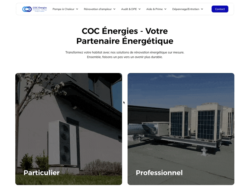 L’objectif principal était de faire évoluer le site de l’entreprise pour qu’il soit à la hauteur de son activité réelle. Coc Energies souhaitait se démarquer des “gros” de la rénovation énergétique, en proposant un site plus clair, plus pédagogique et plus humain, tout en restant très professionnel.